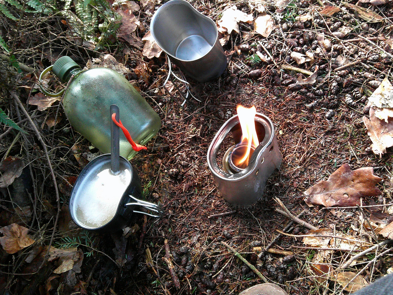 Meths burner and cheap copy US Army canteen kit does the trick I find.